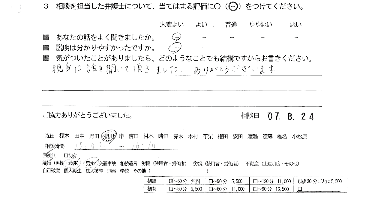お客様の声(ご相談者の声)評判・口コミ 公開日:2025年9月25日 お客様の声 ■年代 ■担当弁護士 ■あなたの話をよく聞きましたか ■説明はわかりやすかったですか - 相川 一ゑ 大変よい 大変よい 親身に話を聞いて頂きました。ありがとうございます。 関連記事 お客様の声(ご相談者の声)評判・口コミお客様の声(ご相談者の声)評判・口コミお客様の声(ご相談者の声)評判・口コミお客様の声(ご相談者の声)口コミ・評判お客様の声(ご相談者の声)評判・口コミお客様の声(ご相談者の声)口コミ・評判 投稿ナビゲーション お客様の声(ご相談者の声)評判・口コミお客様の声(ご相談者の声)評判・口コミ