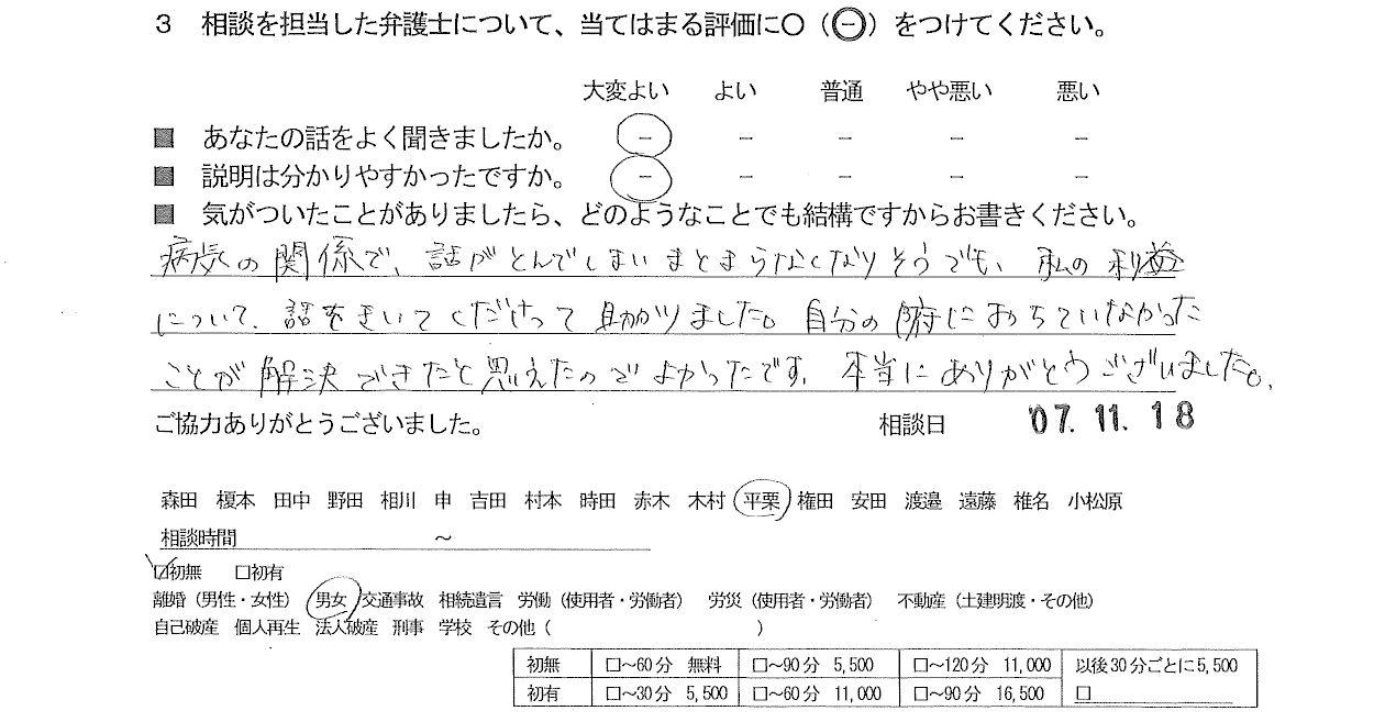 病気の関係で、話がとんでしまいまとまらなくなりそうでも、 私の利益について、話をきいてくださって助かりました。 自分の腑におちていなかったことが解決できたと思えたのでよかったです。 本当にありがとうございました。
