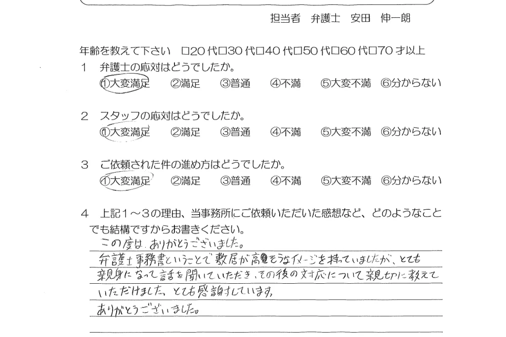弁護士事務所ということで敷居が高そうなイメージを持っていましたが、とても親身になって話を聞いていただき、その後の対応について親切に教えていただけました。とても感謝しています。